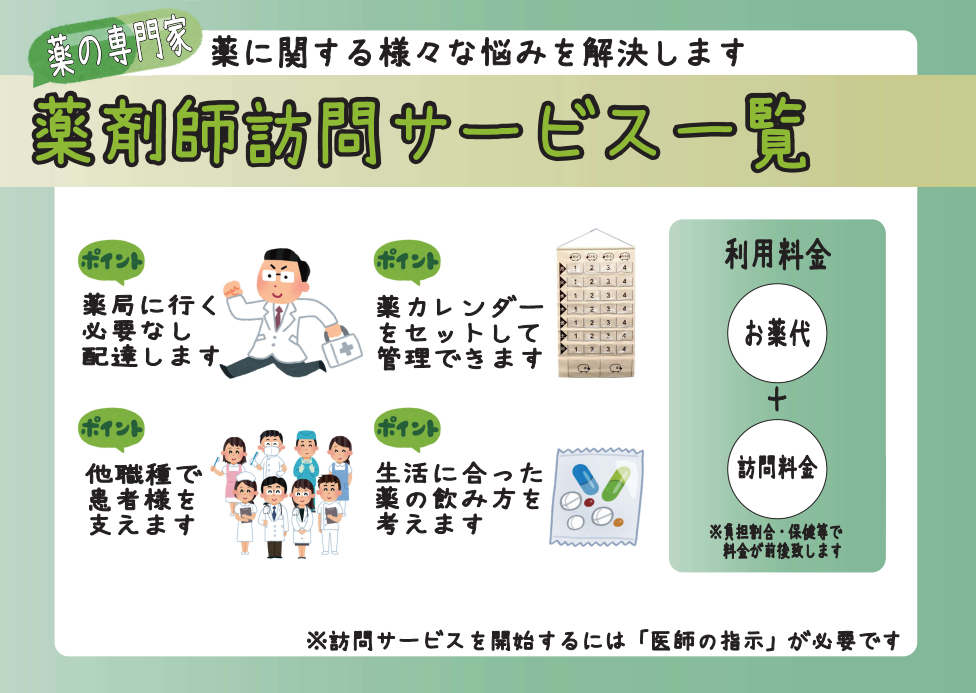在宅訪問にも対応し、患者さまの体調や生活環境に合わせたお薬の管理・指導を行っています。
