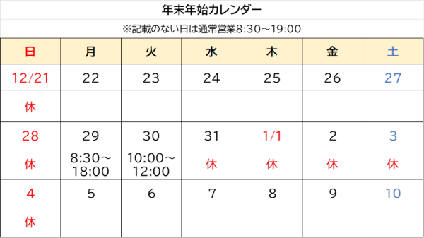 誠に勝手ながら12月29日~1月3日まで営業時間の短縮と休業を表の通りとさせていただきます。